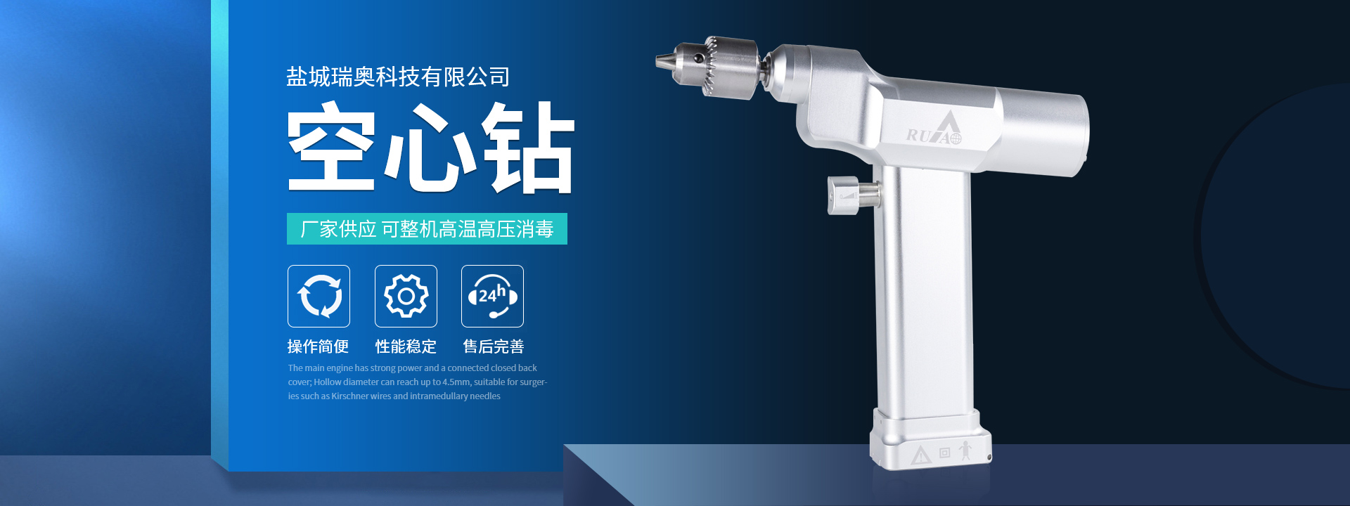 鹽城瑞奧科技有限公司主要產品:醫(yī)用電動鋸鉆系列(可高溫高壓消毒和熏蒸消毒兩種):包含骨鉆、擺鋸、胸骨鋸、空心骨鉆、開顱鉆、顱骨銑等等,適用于骨科、腦外科、神經外科、胸外科、手足及顯微外科、脊柱外科、整形外科等各種手術的要求。電動石膏鋸可切割高分子繃帶、石膏等?;A器械系列:咬骨鉗,髓核鉗,椎板咬骨鉗,持骨鉗,四肢骨折手術器械包等。